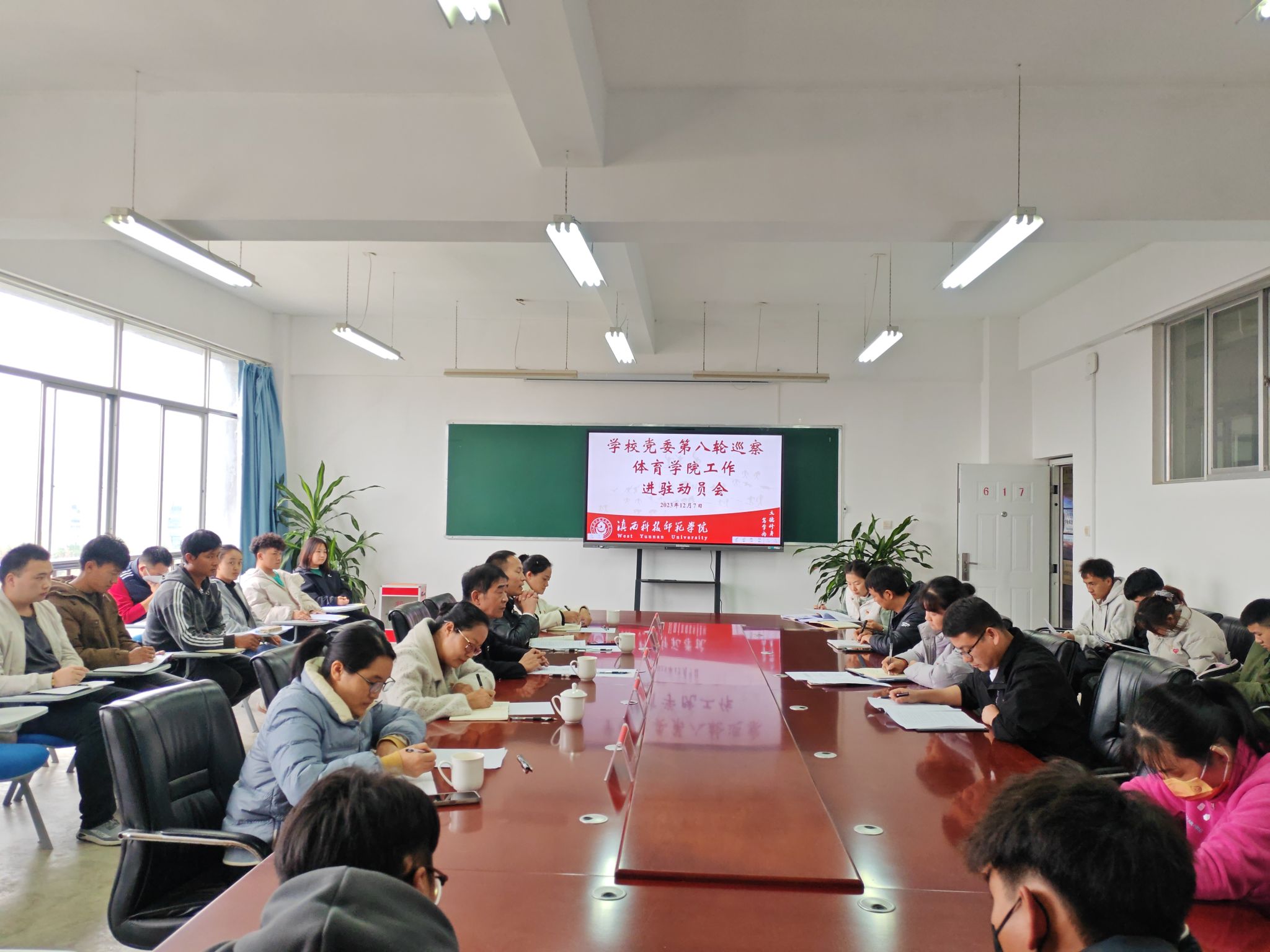 体育学院党政领导班子成员、党委巡察工作领导小组有关人员、第八轮巡察第二巡察组全体成员、全体教职工及学生代表共28人参加了动员会。